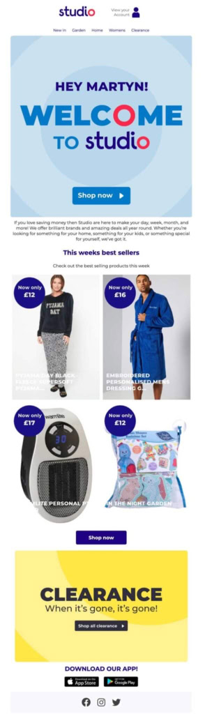Eye-catching imagery with personalized elements is always a win. Hero images with first name, personalized discount codes, or points balances are easy, quick wins. Go further by including a first name on a call-to-action (CTA) for some extra wow-factor. This personalized image is bright, bold, and eye-catching! Not only that, the email also displayed their latest bestsellers using content automation.